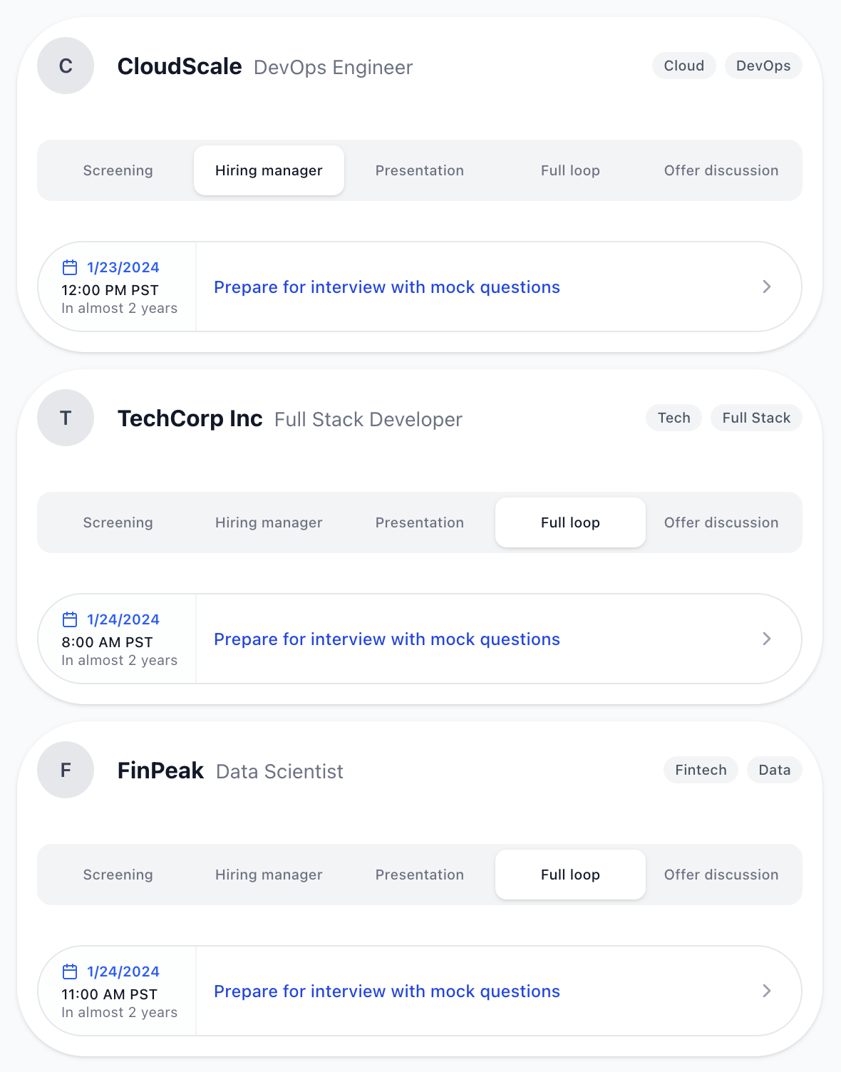 Job-Specific Guidance Advice adapts to the company, role, and stage instead of relying on generic interview tips. | ||